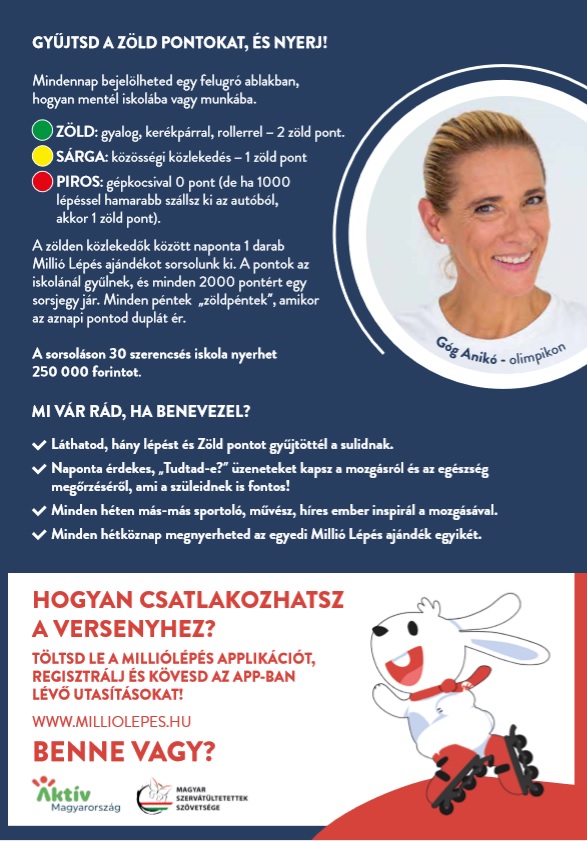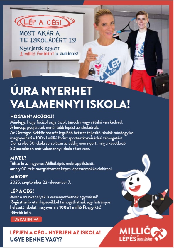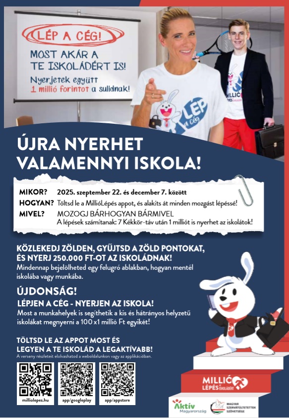 Újra indul a Millió Lépés Program, mely 2025. szeptember 7-től december 7-ig tart majd, és akár 1 millió forintot is nyerhet vele iskolánk! Csatlakozz Te is a programhoz!