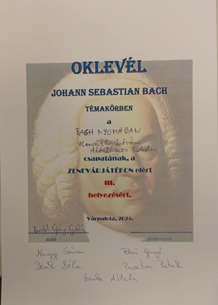 2025. november 11-én zenei vetélkedőn vett részt a „Bach nyomában” nevű csapatunk a Thuri György Gimnáziumban. A kistérségi versenyen a 8.a osztályból Nagy Sára, Deák Béla Krisztián, Fehér Gergő, Pusztai Patrik, Benke Attila képviselték iskolánkat. Egy hajszállal lemaradva a 2. helyezésről a 7 csapat közül 3. helyezést értek el. Gratulálunk a csapat tagjainak ehhez a nagyszerű eredményhez! (Felkészítő tanáruk: Cseresznyés Zsuzsanna)