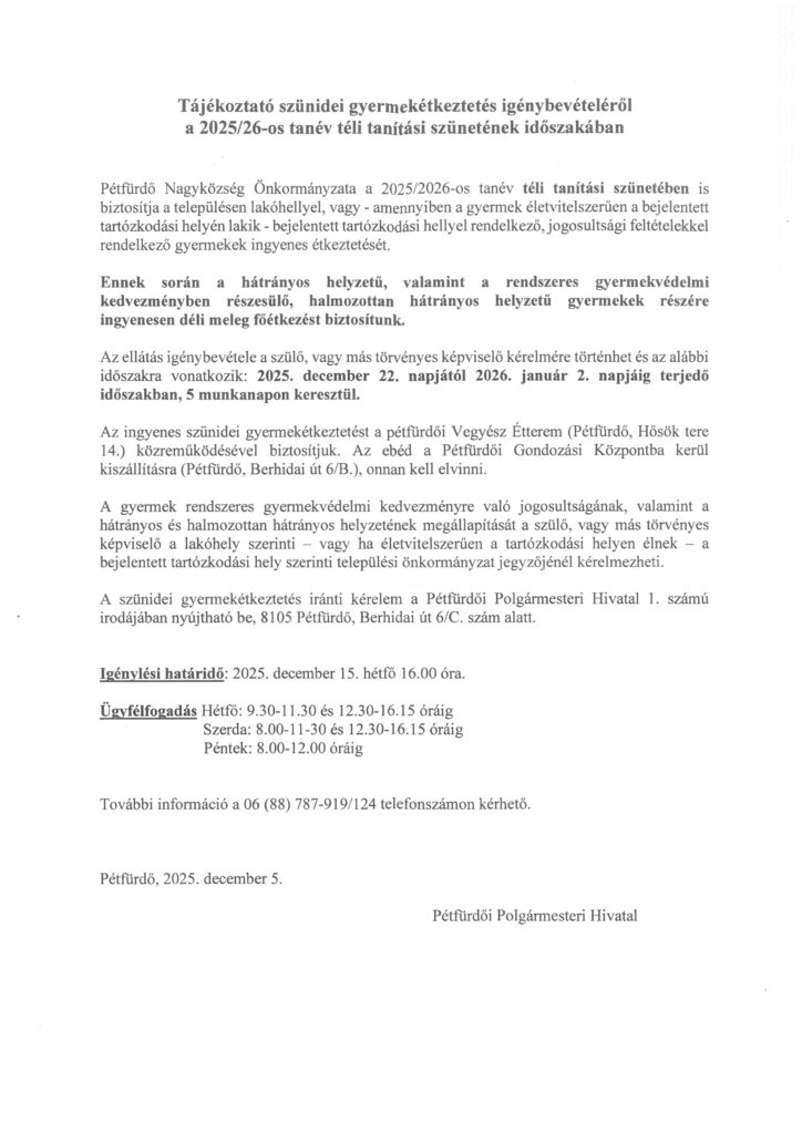 Tájékoztatás a gyermekétkeztetés igénybevételéről téli szünet időszakában